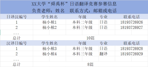 2、请参赛学校的负责老师另页填写相应编号译稿的参赛信息电子版(格式参考例图2),发至会务邮箱[email protected],为方便后续联络,请负责老师寄稿后加QQ群:235669658(江苏省“舜禹杯“翻译竞赛)。