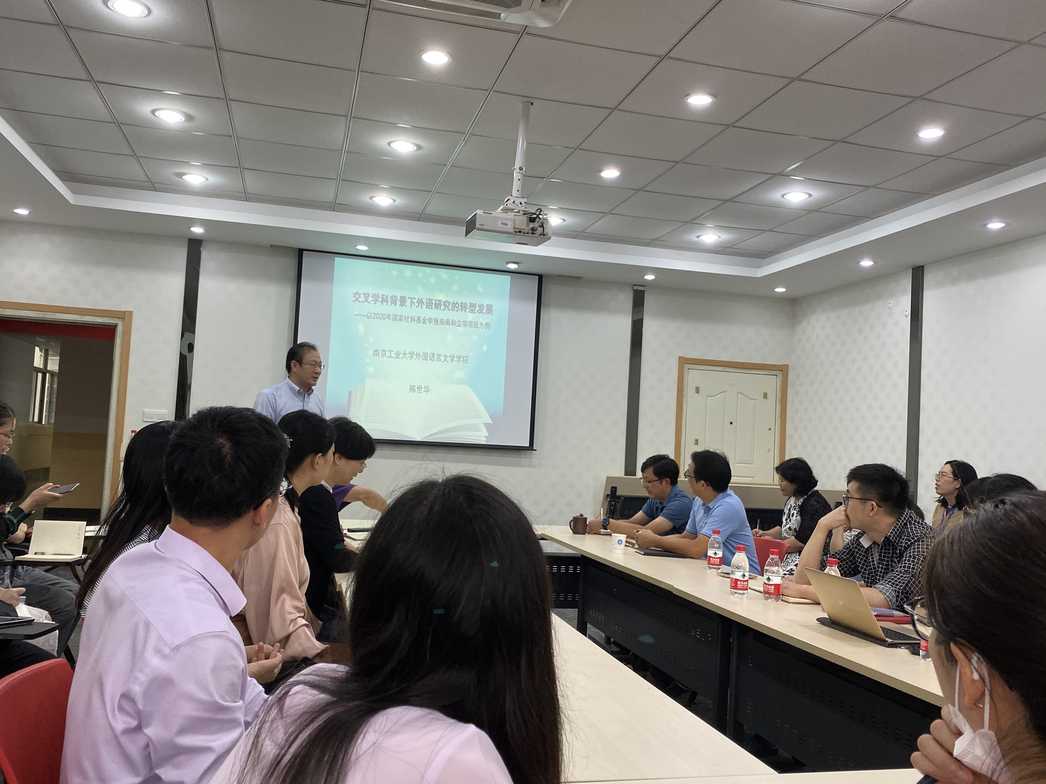 陈世华教授首先详细介绍了2020年国家社科基金项目立项的特点,他指出:今年中标的项目中,一大半选题均与外语相关,陈世华教授鼓励青年学者时时保持问题意识,在学科交叉的背景下多关注时事,拓宽视野,大胆分析。此外,他还从外语与统计学、人口学、政治学、民族学、国际问题研究、中外历史、考古学、宗教学、体育学、图书情报学、新闻传播学等学科融合的角度进行了选题的多重启发。最后,陈世华教授从自身书写基金项目申报书的实际经验出发,为师生们详细介绍和解答了在书写申报书时应当注意的问题和事项。现场氛围十分热烈,师生们踊跃提问,畅所欲言。