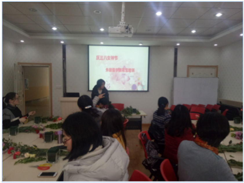 女教师人数多,对此次活动热烈响应,积极报名参与。活动一开始,花艺老师给每位参加活动的女教师发放了培训所用花材,五颜六色的鲜花为节日以及活动都增添了喜庆的气氛。