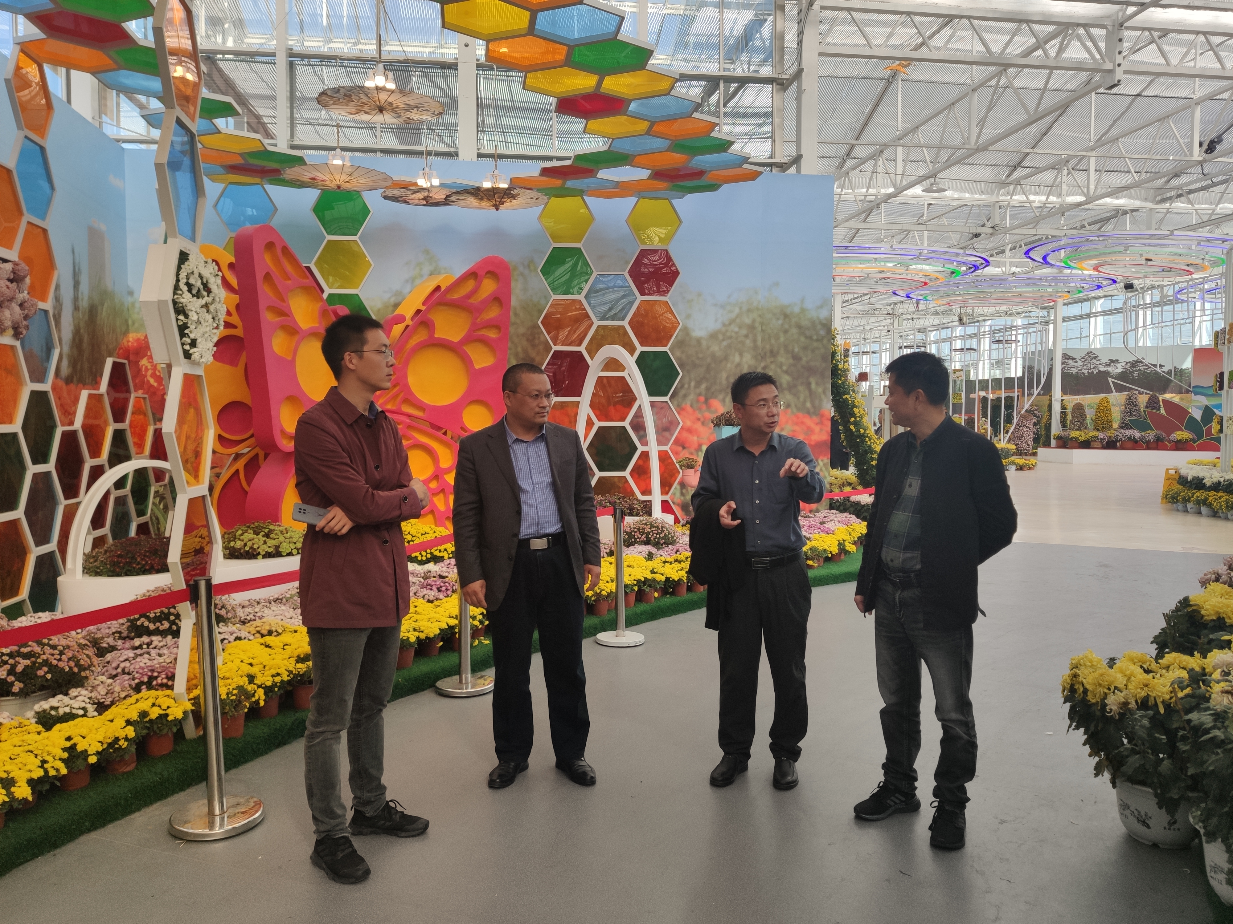 菊花基地的室内展馆、温室育种室等场馆,并在菊花嫁接、育种、插花艺术展举办等方面给予了专业指导并提出了相应的建议。