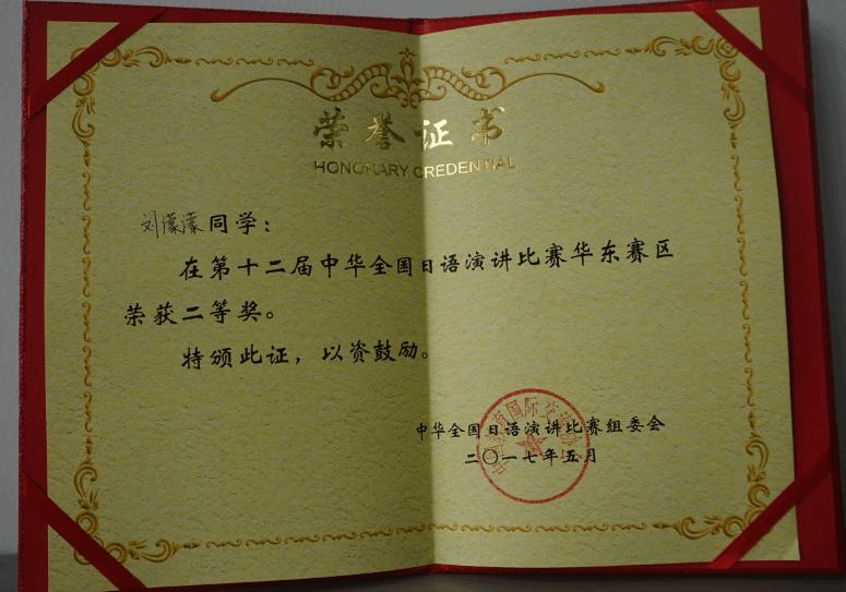 选手刘濛濛同学凭借沉着冷静的超常发挥,最终取得了二等奖,(总体排名与另一名二等奖选手并列第四)的好成绩。这一佳绩也与石原美和老师一月余的辛勤指导密不可分,石原老师也荣获了“优秀指导教师奖”。