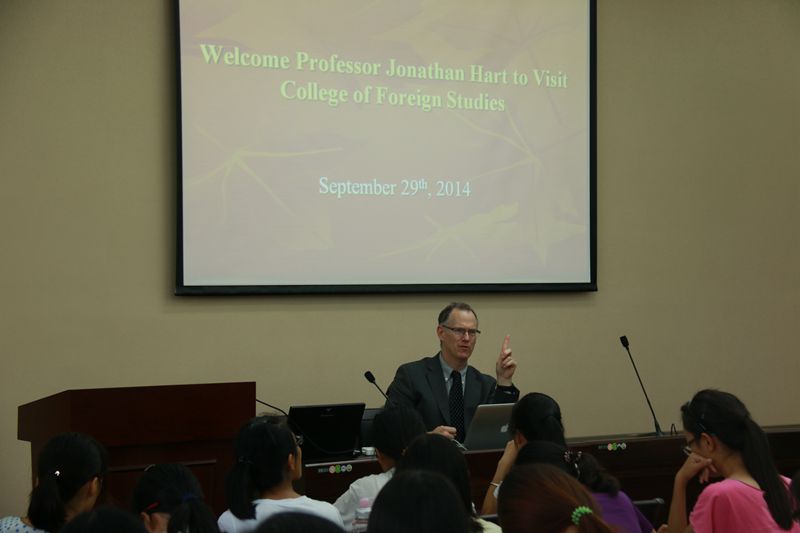 9月29日下午2点,Hart教授在教学楼7楼报告厅作了题为“The Art of Comparative Studies”的精彩讲座。Hart教授从其自身与中国城市的渊源入手,谈论了对比研究的积极意义。接着他深入简出地介绍了欧洲扩张与英语发展的历史。他以《哈姆雷特》一剧为例,阐释了从历史、地理、国别等角度进行比较分析的可能性。Hart教授分析了文学与历史的矛盾关系,认为莎翁历史剧取材于历史而又重饰历史。Hart和在座师生交流了对文学作品的理解,语言的发展趋势等问题。