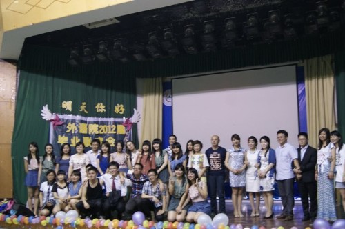 2012届毕业联欢会在大学生活动中心成功举行。此次毕业联欢会以“你好,明天”为主题。外语院党委书记韩纪琴、外语院副院长王宏林、国教院副院长石松、外语院党委副书记姚科艳、校长办公室综合科邵士昌、辅导员徐文以及外语院大四各班班主任作为嘉宾出席了此次联欢会。