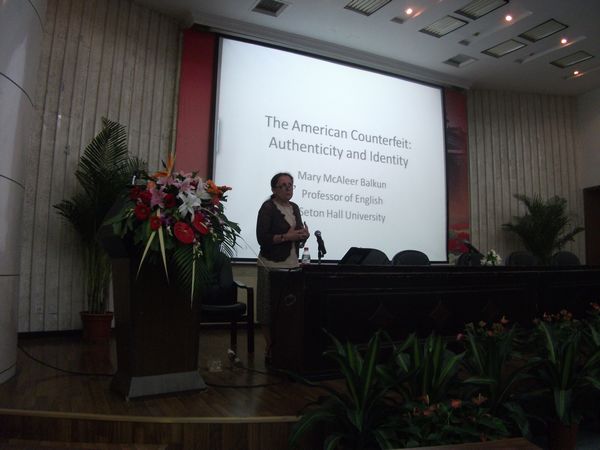 英语教师做了一场题为“What Is Student-Centered Learning?”(何为以学生为主的教学)的报告,概述了教师为主的课堂教学的历史,优势与不足,以及教学形式的改变发展情况,学生为主的教学模式理念、实践、操作方法等,报告之后教师与美国专家做了问答和交流,探讨学生为主的教学实践中的各种具体问题和设想。在此之后她与英语系文学专业教师做了文学沙龙活动,共同探讨在网络化信息时代,文学教学和研究的现状、走向,和未来的展望。南京理工大学三名文学教师也参与了讨论。22号上午Balkun教授到英语系大三的美国文学课堂参观,对学生的课堂报告做了点评和指正,并且对文学课堂的气氛,教师的课堂组织和启发,学生的参与和表达,都给予了很高的肯定。22号下午Balkun教授面向全校师生做了题为“American Counterfeit:Authenticity and American Identity”(美国赝品:真实性与美国身份)的学术报告。Balkun教授讲座生动流畅,思路分明,逻辑性强,治学严谨,听众受益匪浅。学生的鲜花让讲座现场气氛更为热烈。讲座之后不少师生依然与Balkun教授进行了进一步的交流。