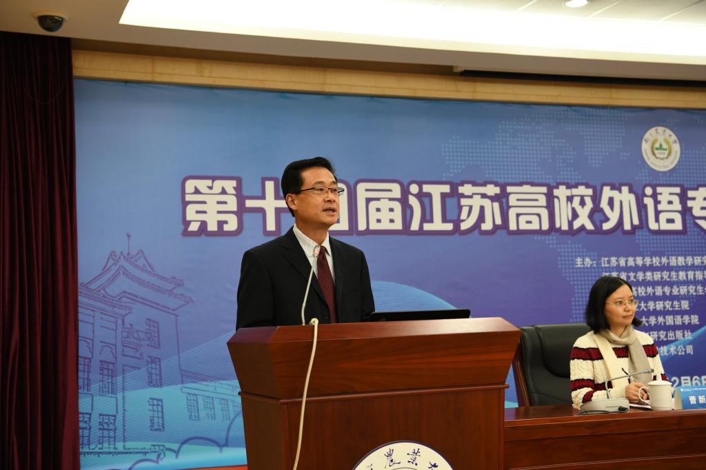副院长曹新宇宣读了江苏省文学类研究生教育指导委员会发来的贺信。贺信提到,外语专业在讲好中国故事、传播好中国声音,阐释好中国特色、构建中国国际话语权等方面一直发挥着重要作用。本次研究生论坛对拓宽外语专业研究生的学术视野、加强学术交流意义重大,有利于营造善于思考、刻苦学习、严谨治学、敢于创新的良好学风和学术氛围。