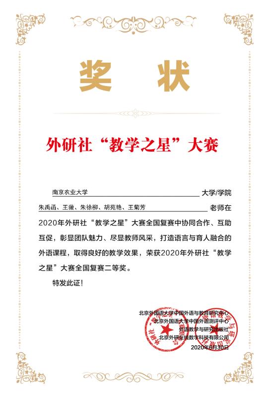 选派的教学团队喜获佳绩:朱禹函、王薇、朱徐柳、胡苑艳、王菊芳获得大学英语组团队二等奖。