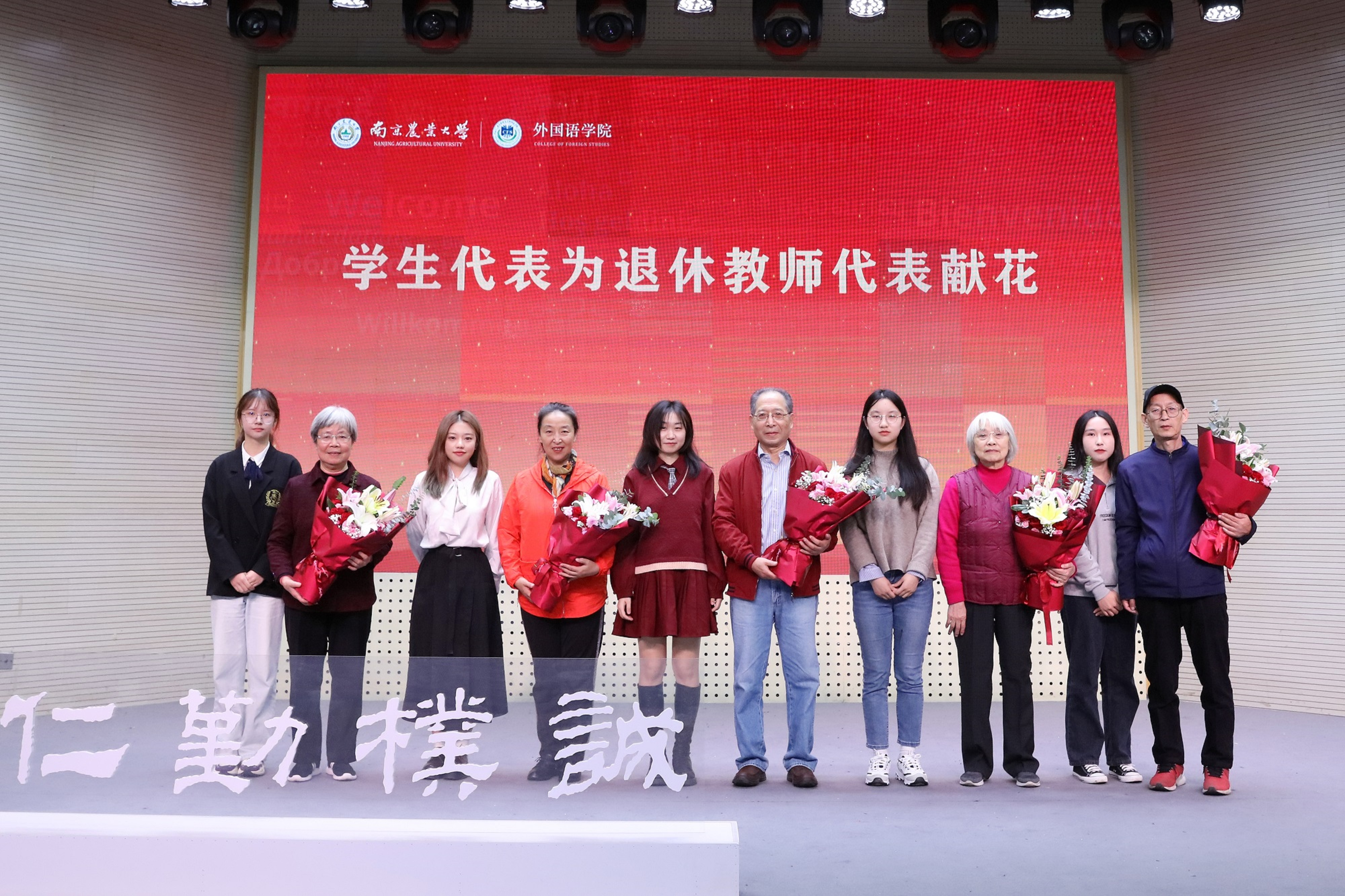 工作过的五位退休教师代表景桂英、王廉军、邓昭春、李翠英、郭凡献上鲜花,感谢他们为学院的建设发展做出的贡献。