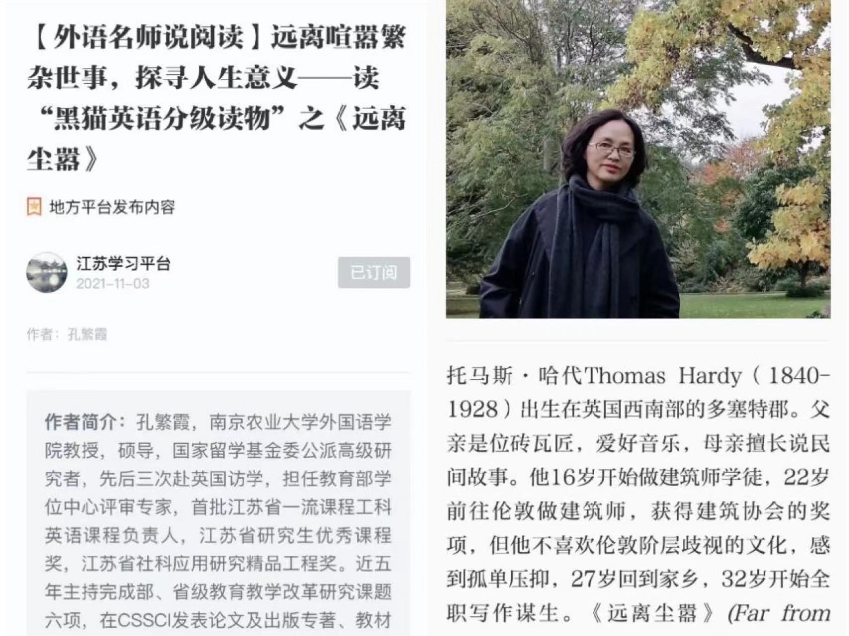 孔繁霞教授在“学习强国”江苏学习平台发表题为《远离喧嚣繁杂世事,探寻人生意义——读“黑猫英语分级读物”之〈远离尘嚣〉》的文章。