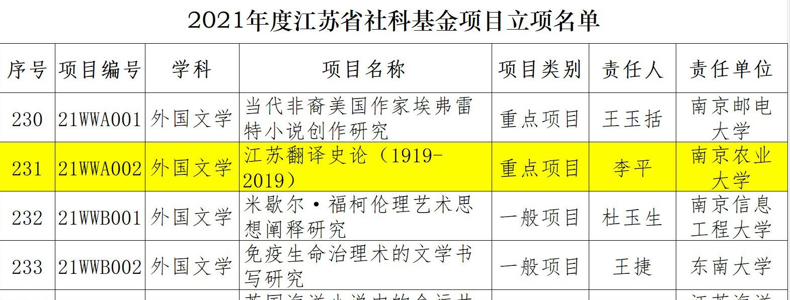李平教授主持申报的《江苏翻译史论(1919-2019)》获江苏省社科基金重点项目立项,这是哔咔漫画