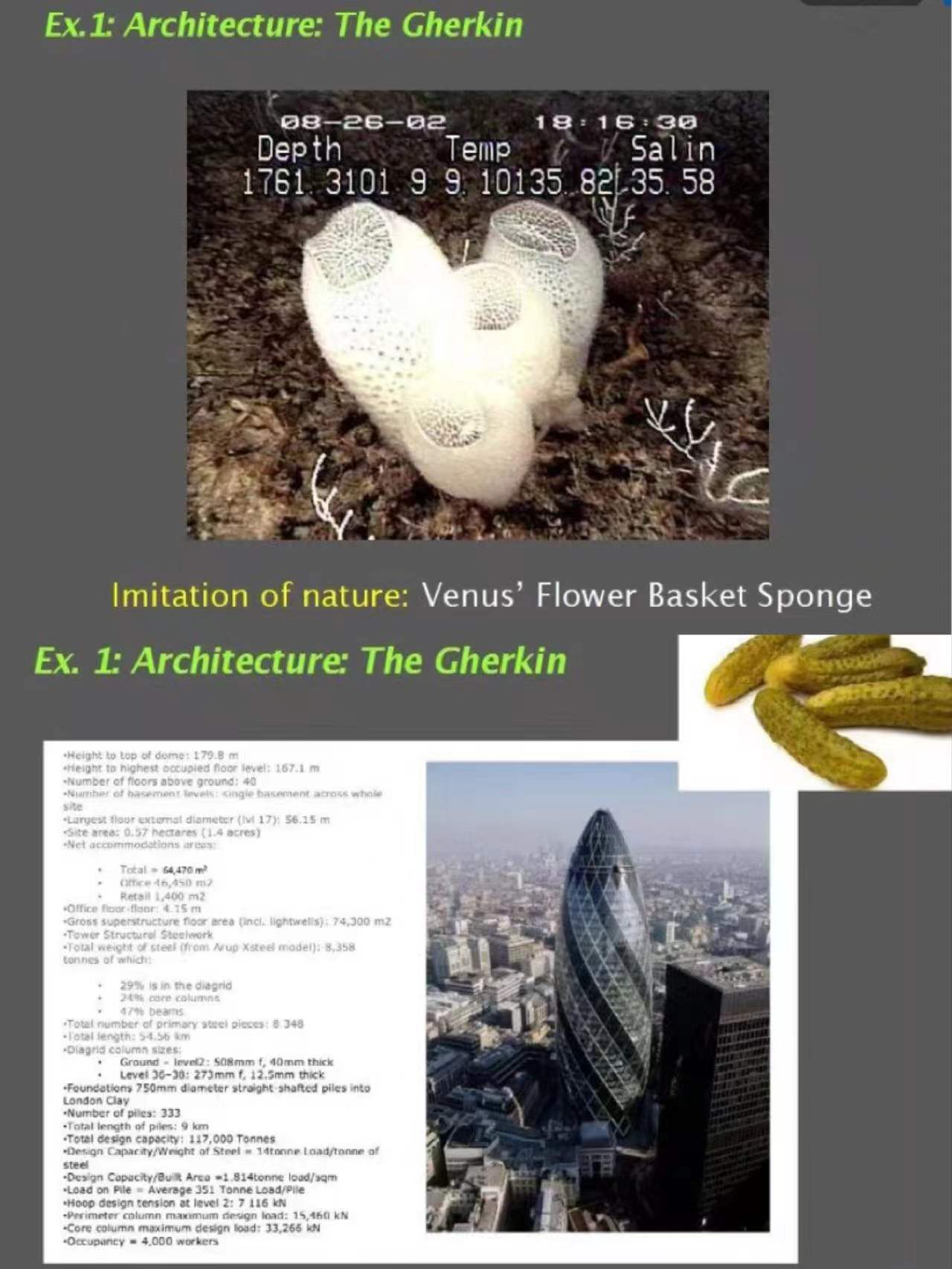 拉森教授以两个生动具体的事例佐证了他的观点。一是位于英国伦敦金融区绰号为“小黄瓜”(The Gherkin)一座摩天大厦,其建筑理念灵感取自自然界中一种名为“维纳斯的花篮”(Venus’Flower Basket)的海绵特殊的结构,充分实现了对自然的模仿、利用与整合,使通常被认为给高层建筑带来威胁的风力变为能够在建筑内部平缓流动的风能,建筑结构设计大厦自带的花园部分也显示了技术对自然风景规划的助推作用,起到了利用自然能源实现节能减排的环保效果。