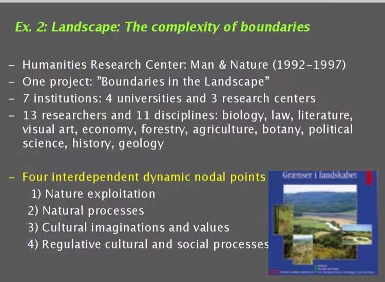 另一个事例是拉森教授召集4所大学、三个研究中心,跨11个不同学科共13位研究者共同开展的一项题为“风景中的疆界”的研究课题。在这个历时6年的研究项目中,拉森教授与各学科的研究者消解了学科壁垒,整合了生物学、法律、文学、视觉艺术、经济、林业、农业、植物学、政治科学、历史、地理学等跨学科多重视角,重新定义、划定疆界,研究了四个相互依赖的节点——对自然的利用,自然过程,文化想象与文化价值观,以及文化与社会过程的制约——旨在实现更大意义上的人与环境的良性依存关系。