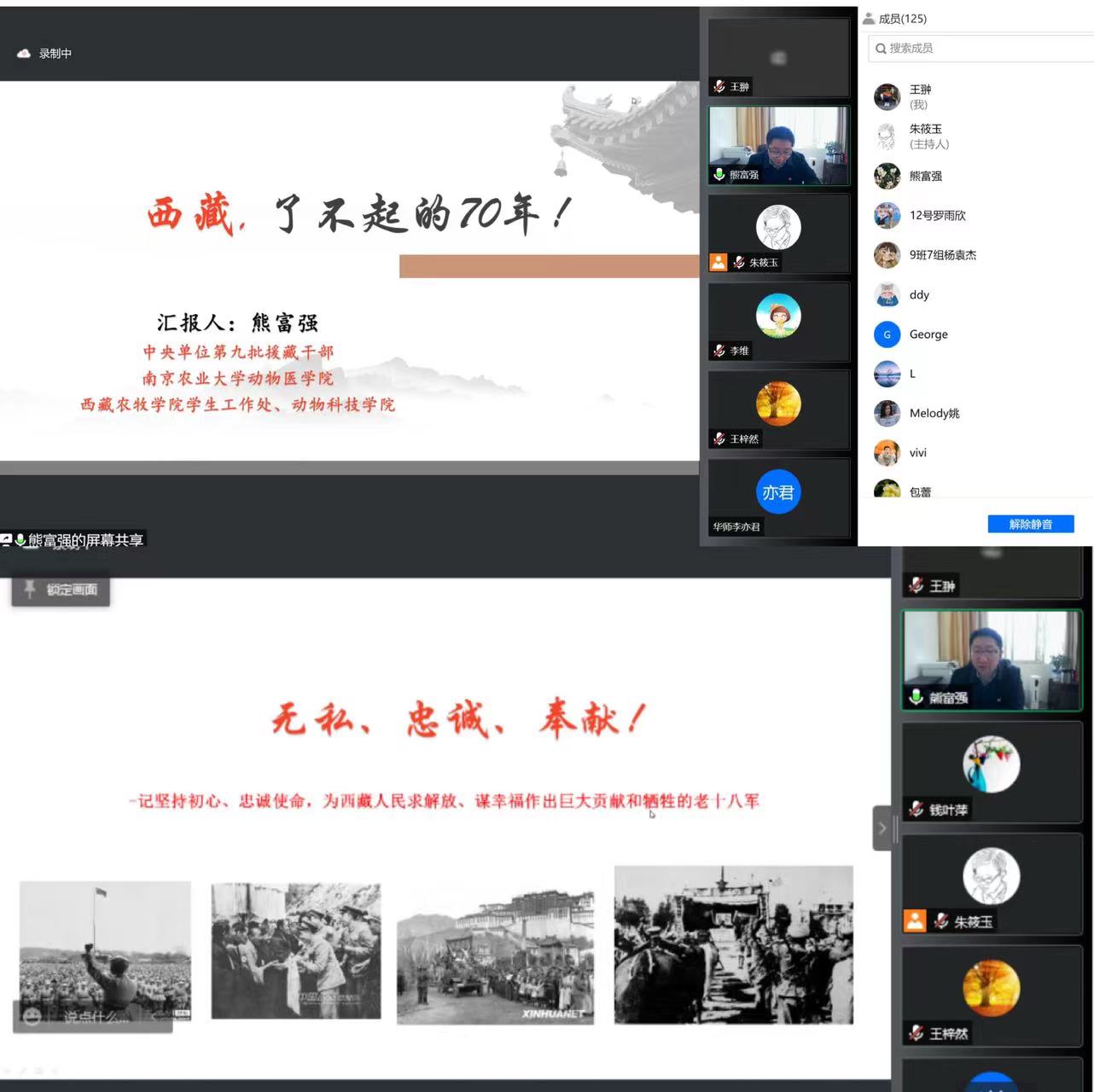 动物医学院党委副书记,西藏农牧学院学工处副处长、动物科学学院党委副书记、副院长熊富强为全院师生党员作了题为“西藏,了不起的70年”专题报告,近200名师生在线聆听了报告。报告由学院党委书记朱筱玉主持。