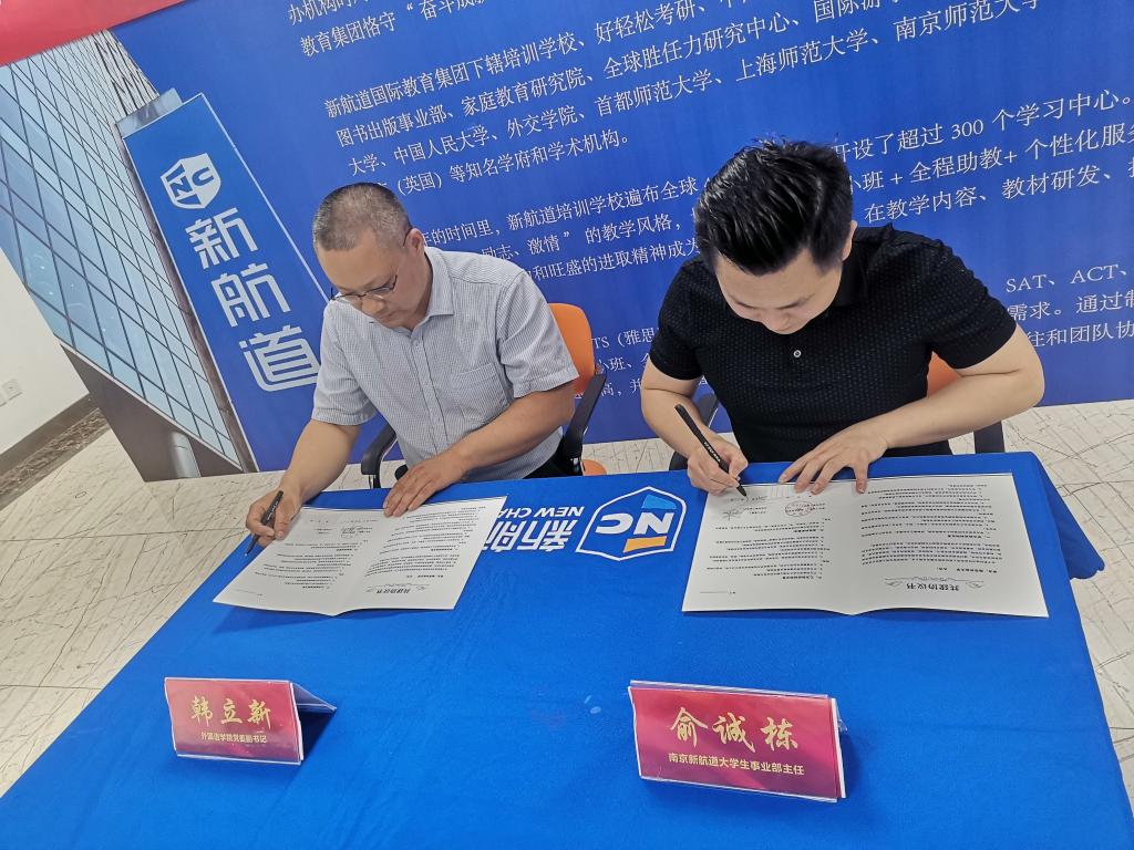 党委副书记韩立新、学工办主任甄亚乐、党务秘书王翀,南京新航道大学生事业部主任俞诚栋、市区考研市场经理李鑫、考研项目负责校长丁伊诺等参加签约仪式并进行了交流座谈。