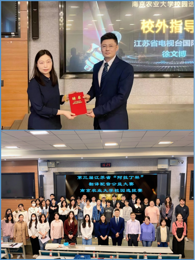 院长裴正薇代表学院,向徐文博老师颁发了配音比赛校外指导教师聘书。她向所有参赛团队表示祝贺,认为选手们的精彩演绎使人有身临其境之感。裴院长指出,经过几届的成功举办,“阿拉丁杯”翻译配音大赛的影响力与参赛面不断扩大,是江苏省高等教育学会认定的省级赛事。她希望同学们认识到译配的重要意义,爱上配音,不断提高声音表现力、角色塑造力与团队协作力,推动中华优秀传统文化的译介,做好新时代中国故事的讲述人和传播者。