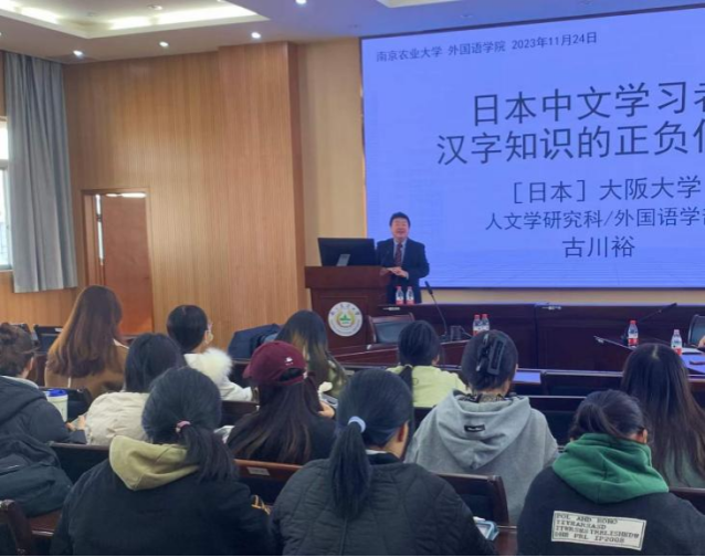 11月27日下午,古川裕在卫岗校区作题为“日本中文学习者的偏误特色及其教学对策”的主题学术讲座。此次讲座由李红主持。古川裕从研究对象、分析材料和研究目的三个部分展开论述,通过日汉语应用对比案例,分析日本中文学习者的偏误产生机制,得出偏误出现的4种原因,并为中日文教学指出解决策略。古川裕认为偏误研究的分析结果能成为预测学生学习难点和弱点的标尺,可以为设计和实施预防偏误的教学对策提供参考。