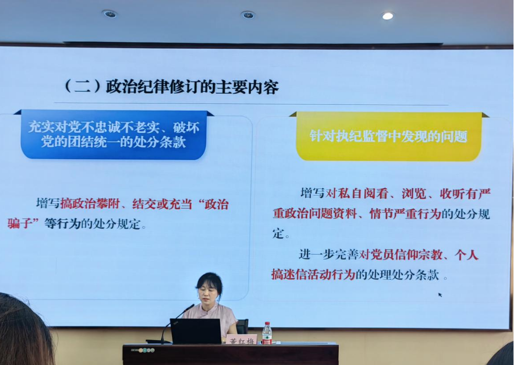 党委书记董红梅在教学楼七楼报告厅为全体研究生党员讲授题为“学条例 守党纪 强党性”党纪学习教育专题党课。该专题党课由研究生辅导员、英语研究生党支部书记曹璇主持。