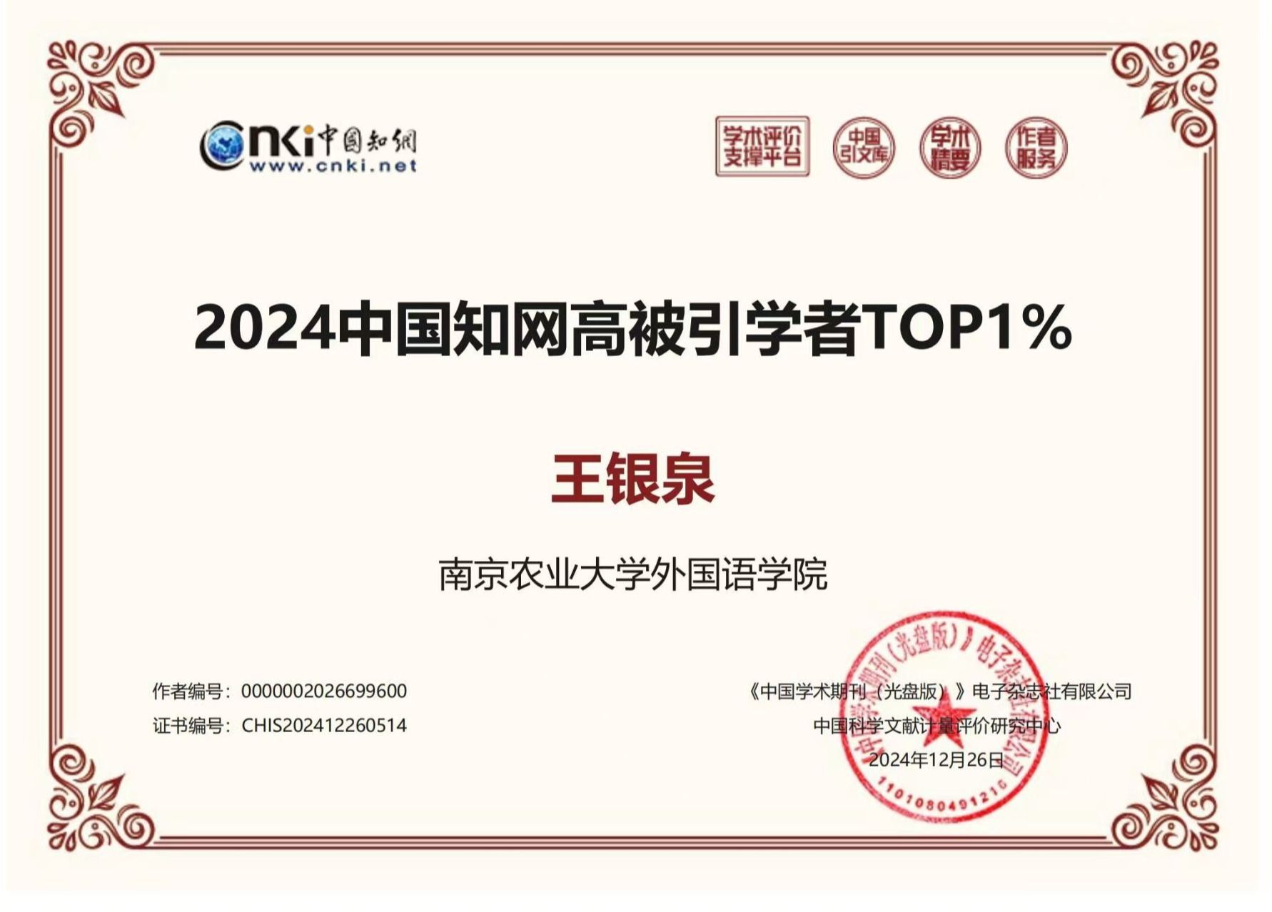 王银泉教授入选“2024中国知网高被引学者TOP1%”。