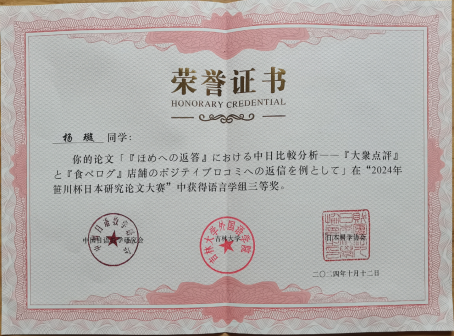 2021级日语专业学生杨璇凭借论文《「ほめへの返答」における中日比較分析―「大衆点評」と「食べログ」店舗のポジティブロコミへの返信を例として》荣获三等奖,实现了哔咔漫画