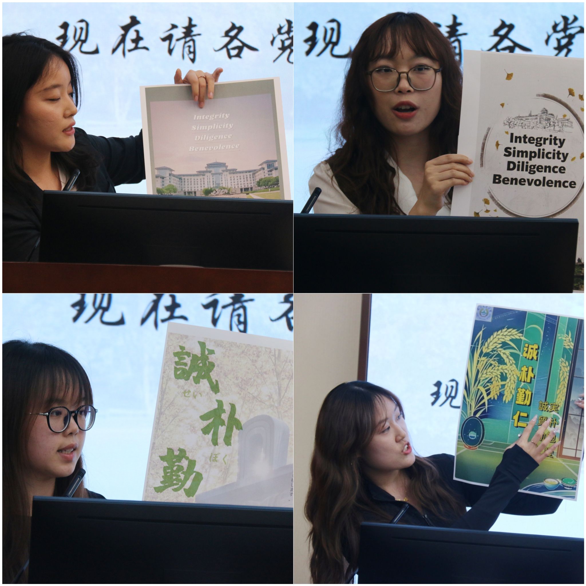 四个党支部围绕校训核心,创作中英日三语标语,并通过彩绘海报展现多元解读。英语本科生党支部设计中英双语标识系统,围绕诚信做人、朴实养德、勤奋学习、仁爱立志四个方面,展现外语学生既传承中华文化根基又具备国际沟通能力的双重特点;英语研究生党支部搭建双语实践框架,通过中华美德与国际价值观对话平台,将家国情怀培养与全球竞争力提升相结合。日语本科生党支部融合传统书法与现代设计,构建学术求真、文化包容、踏实治学、人文关怀四维实践体系,以语言研究促进文明互鉴;日语研究生党支部以"诚实、质朴、勤奋、仁爱"为核心的价值观,打造中日双语育人平台,形成从语言学习到文化理解再到文明传播的分阶段培养模式。