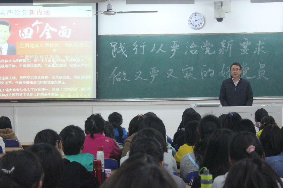接着,吴群引用习近平“打铁还需自身硬”的讲话,简明扼要地讲解了包括制定实施八项规定和六项禁令、扎实开展党的群众路线教育实践活动、深入推进“三严三实”专题教育以及不断加强和改进巡视工作在内的从严治党新举措。他指出,在这些新举措的作用下,从严治党必将提高到新水平,党的自我完善、净化能力会进一步增强。随后,他从入党动机、政治学习、组织观念和模范带头作用四个层面准确犀利地点明学生党员之中存在“不严不实”的表现,并抛出了“学生党员干部如何发挥自己的效能”的基本问题,并提出,解决这个问题,政治定力、理论素养、浩然正气和过硬本领四者缺一不可。最后,吴群鼓励学生党员们以共产党先辈们为榜样,爱国、爱农、爱校,在实际行动中培养“世界眼光、中国情怀”,在回报祖国和人民中成就自己的光辉人生。