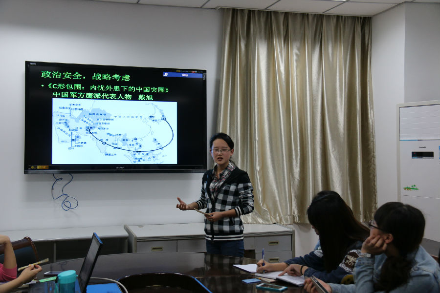 各学生党员以PPT形式汇报了《人民日报》的学习心得。英语本科生党支部老党员甄亚乐同志以“创”字引出了创业这个热门话题,鼓励大家拓展出自己的一片天。接着老党员王澍、预备党员陈心怡与大家分享了保护动物、清明扫墓新花样、旅游中的不文明行为、生态与经济问题等多则新闻,将目光聚焦在身边的小事上,号召大家保护自然及生物,注重个人言行举止,倡导可持续发展。随后老党员胡煜、预备党员潘亦欣、华瑜兰、周芳燕从习近平出席亚非会议、中国与巴基斯坦的友谊、“一带一路”这几则国家大事出发,回顾历史,分析现状,展望中国美好未来。随后,日语本科生党支部预备党员刘晶晶为展现南水北调对沿线民众的影响,讲述了丹江口库一个普通百姓为此反复多次搬迁的故事;预备党员郭璐瑶、廖继领、颜莹莹通过汇报展示,阐述了自己对于两岸关系、淘洋货热潮和国产动画的见解与看法,图文并茂,生动有趣。汇报期间,卓婷婷老师时不时提出问题,汇报人与在座各位都积极回应与讨论,活跃了同学们的思维,拓宽了大家的知识面。