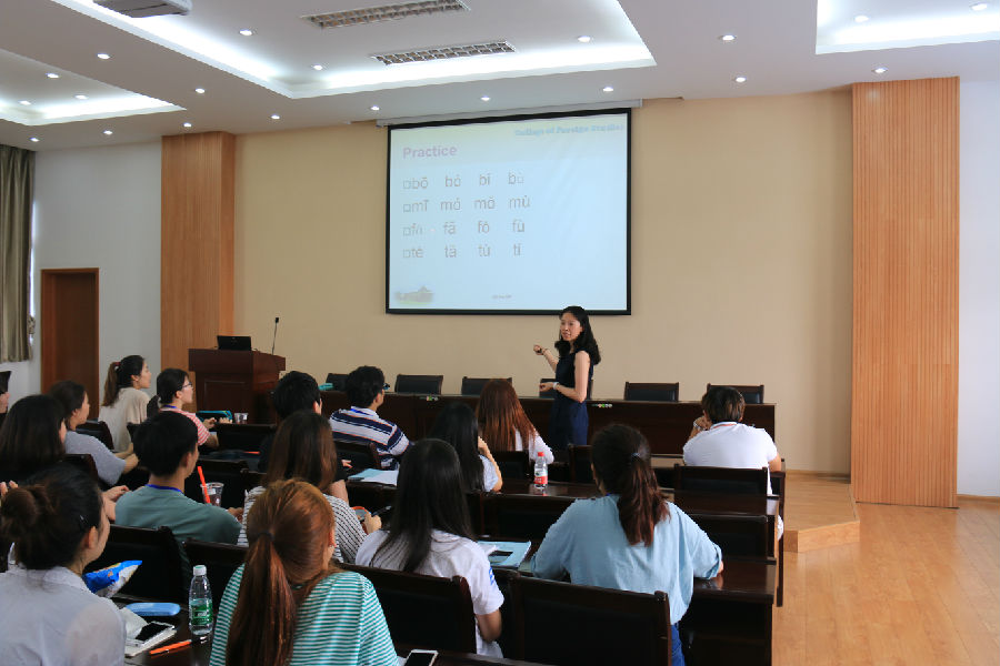 老师钱叶萍进行授课。钱叶萍老师从最基本的声母、韵母以及声调讲到拼读方法,还教授了许多日常用语,包括“你好”、“再见”、“谢谢”等简单又常用的打招呼用语。