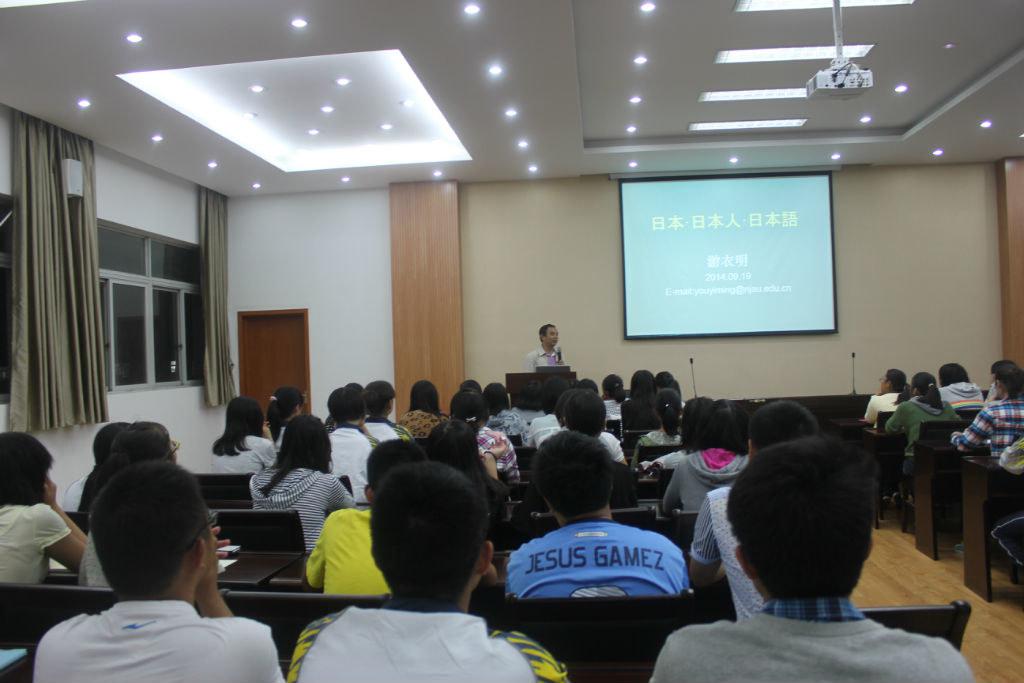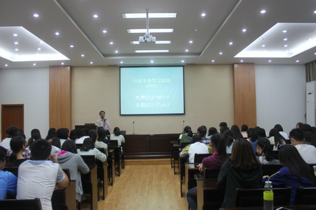 副院长游衣明教授在教学楼报告厅举办了一场题为《日本 日本人 日本語》的报告会。全体日语系大一新生参加了此次报告会。在报告会中,游教授结合个人经历与想法,“客观”地向日语系新生们传递了许多“实实在在的信息”。