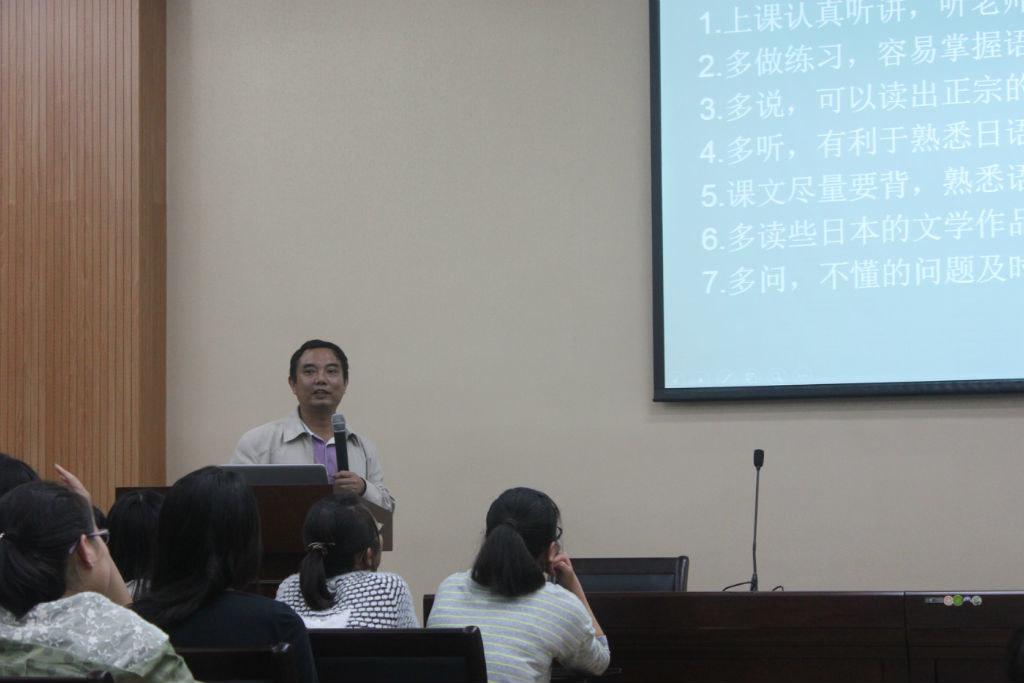 在对新生表达了热烈的欢迎以及简短的自我介绍后,游院长就日本略覧,日本国民特性,日本語言和日語学習四大方面全面地向新生介绍了日本、日本人、日本语。