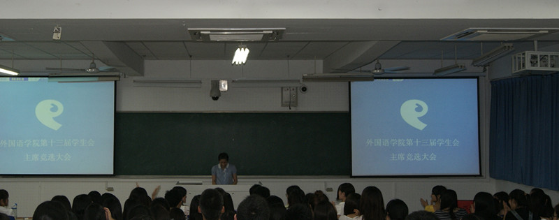 6月4日晚上6点30分,外语院第十三届学生会主席竞选大会在教学楼C503隆重召开。出席本次竞选大会的有外语院辅导员徐文,方淦,兼职辅导员高艳丽、周芹、吴柯蓉,以及特邀嘉宾动科院辅导员刘素惠。此外,外语院第十二届学生会全体干部及部分学生代表也参加了本次会议。
