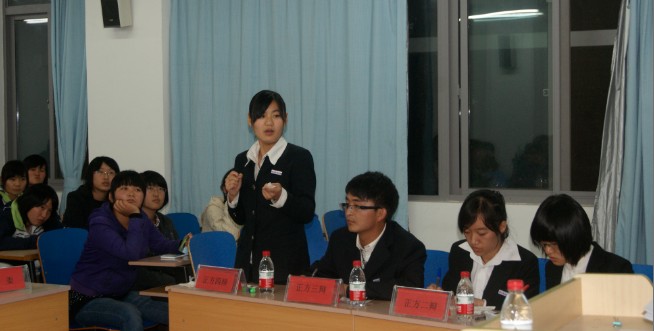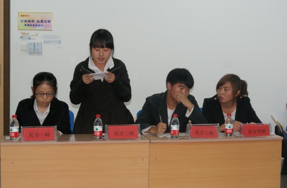 本次辩论赛辩题为:网络语言对汉语言影响的利弊关系。正方成员支持利大于弊,由英语111班四位同学组成。反方成员支持弊大于利,由日语113班四位同学组成。