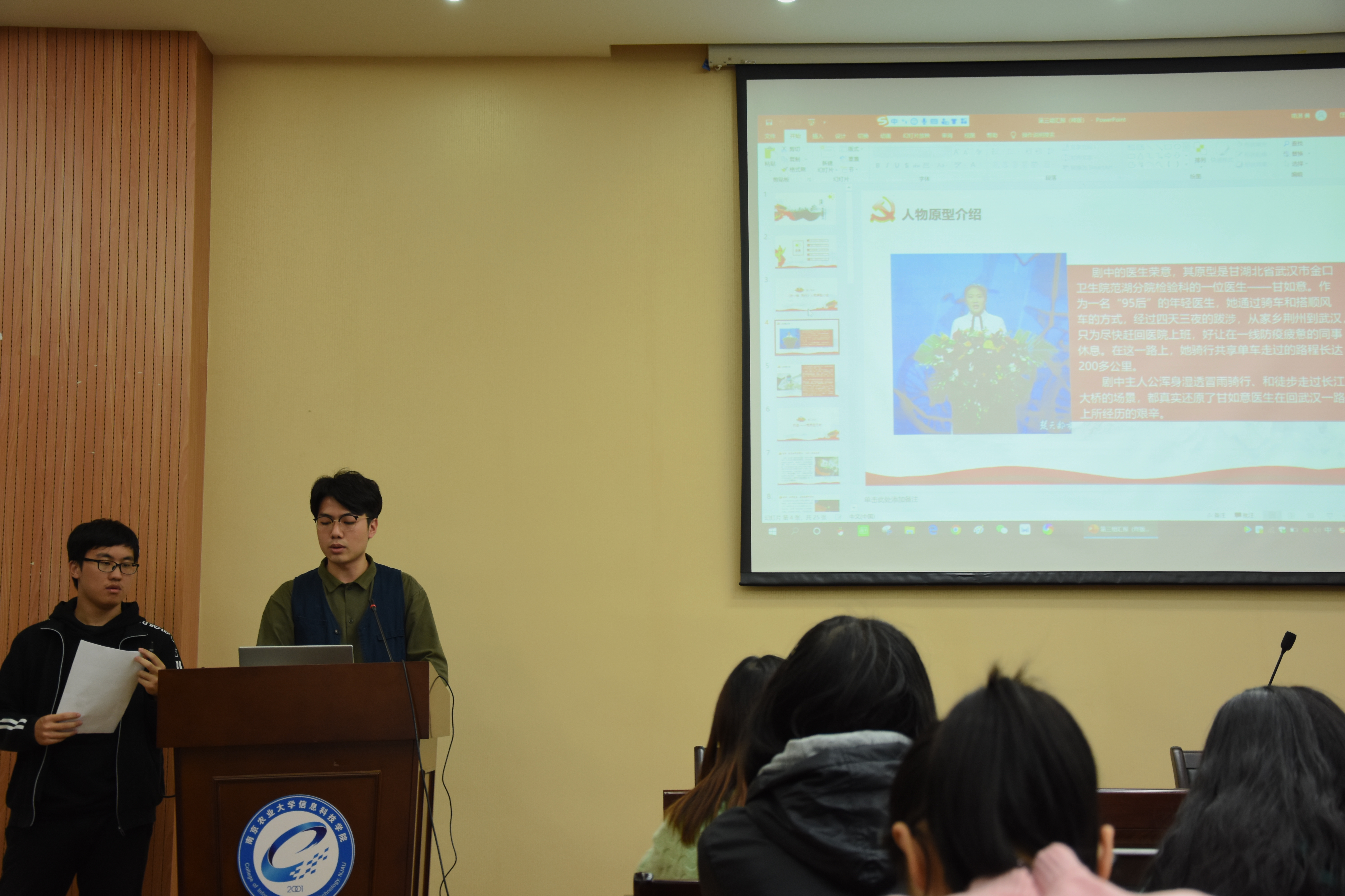 汇报交流会上,第二组成员通过《摆渡人》的故事与人物原型介绍,生动展现了疫情期间武汉外卖小哥“老计”的工作,诠释着无数默默无闻的骑手们在危难时刻连接此岸与彼岸,将每个人的心紧紧连接在一起。第四组成员讲述了《救护者》中首批抵鄂人员支援武汉,在照顾病患的同时与病魔作斗争的故事,生动地展现了救护者们在救治患者过程中的困难,体现了医患之间最真实的关怀与救护。